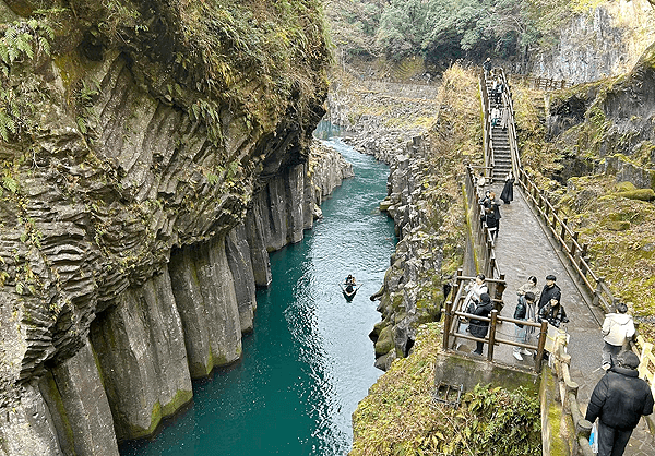 高さ約80~100mもの断崖が約7kmに渡って続く高千穂峡。その雄大な渓谷美は、阿蘇山の火山活動で噴出した火砕流を五ヶ瀬川が侵食して作られました。